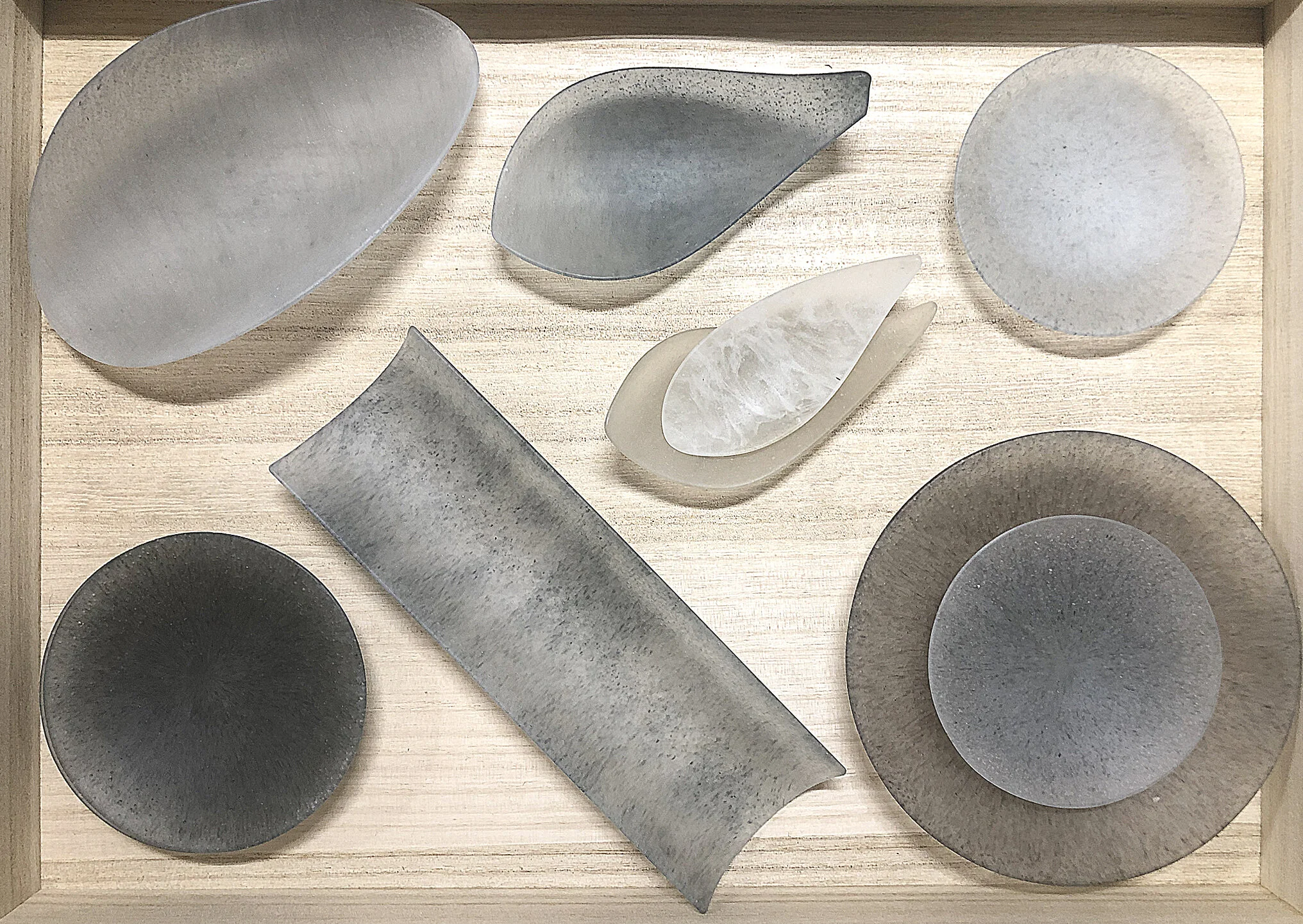 After making careers as potter over 10 years, she changed her main material from clay to glass. There is a similarity in process between pottery and Pâte de verre, both kiln work, yet Pâte de verre allows her more free creation, because she can shave the piece until very end of work process even after burning to achieve the form she wants.