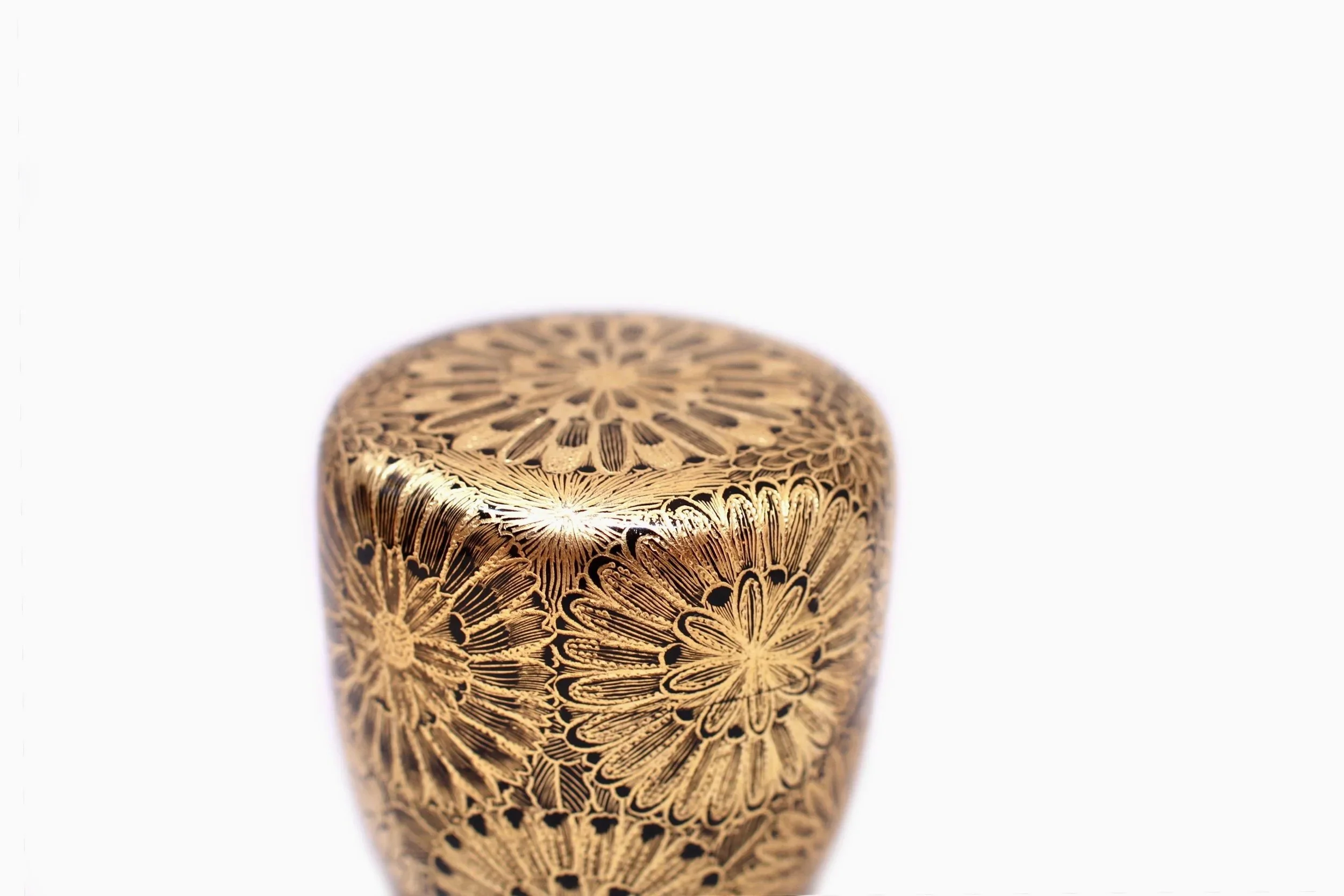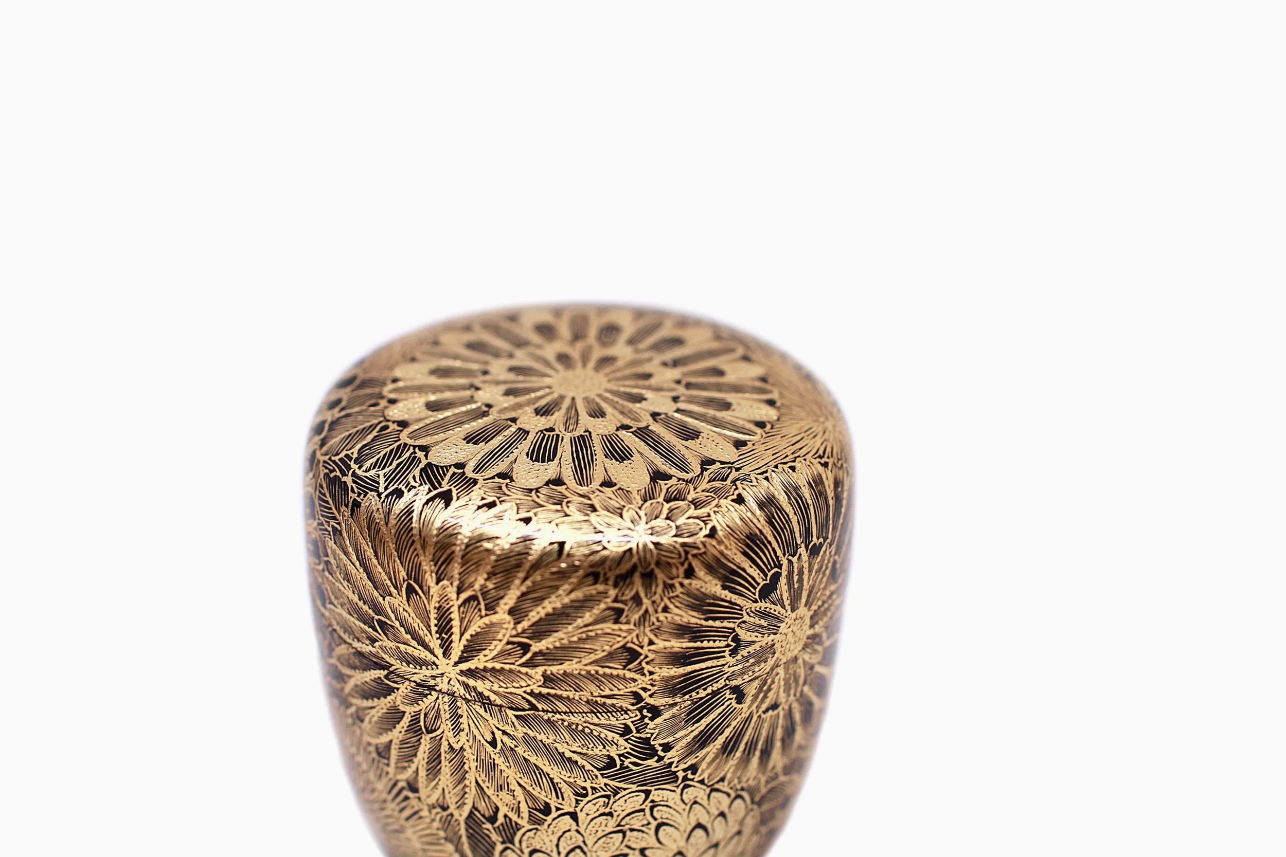 This Matcha caddy is embellished with chrysanthemum motifs rendered in traditional Chinkin technique in which fine lines and dots are carved into the surface and inlaid with gold powder.